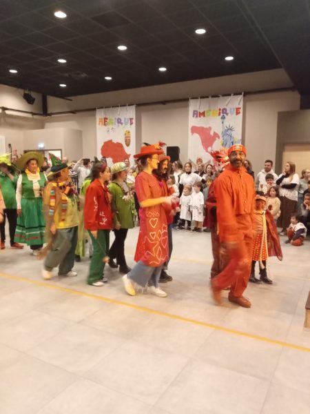 Cette soirée a été l’occasion d’un défilé de costumes dansé, afin de donner le ton du carnaval et montré le travail déjà effectué par l’atelier costume animé par Virginie DOLLAT, ainsi que les décorations sur tenture réalisées par l’atelier dessin mené par Odile Ode.