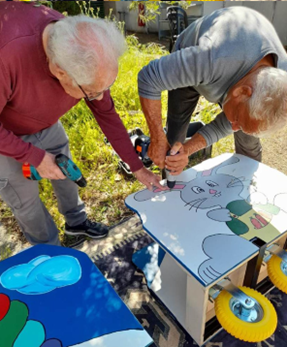 Chaque jeudi, de Février 2025 à Mai 2025, bénévoles et résidents ont œuvré ensemble dans la découpe, l’assemblage, les dessins et la peinture des modules. Les matériaux proviennent essentiellement de la matériauthèque de l’Institut.