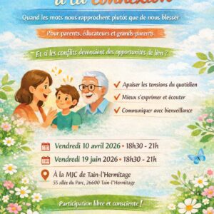 La MJC-CS Tain vous propose deux ateliers sur le thème de la Communication non-violente (apaiser les tensions du quotidien – mieux s’exprimer et écouter – communiquer avec bienveillance) :
